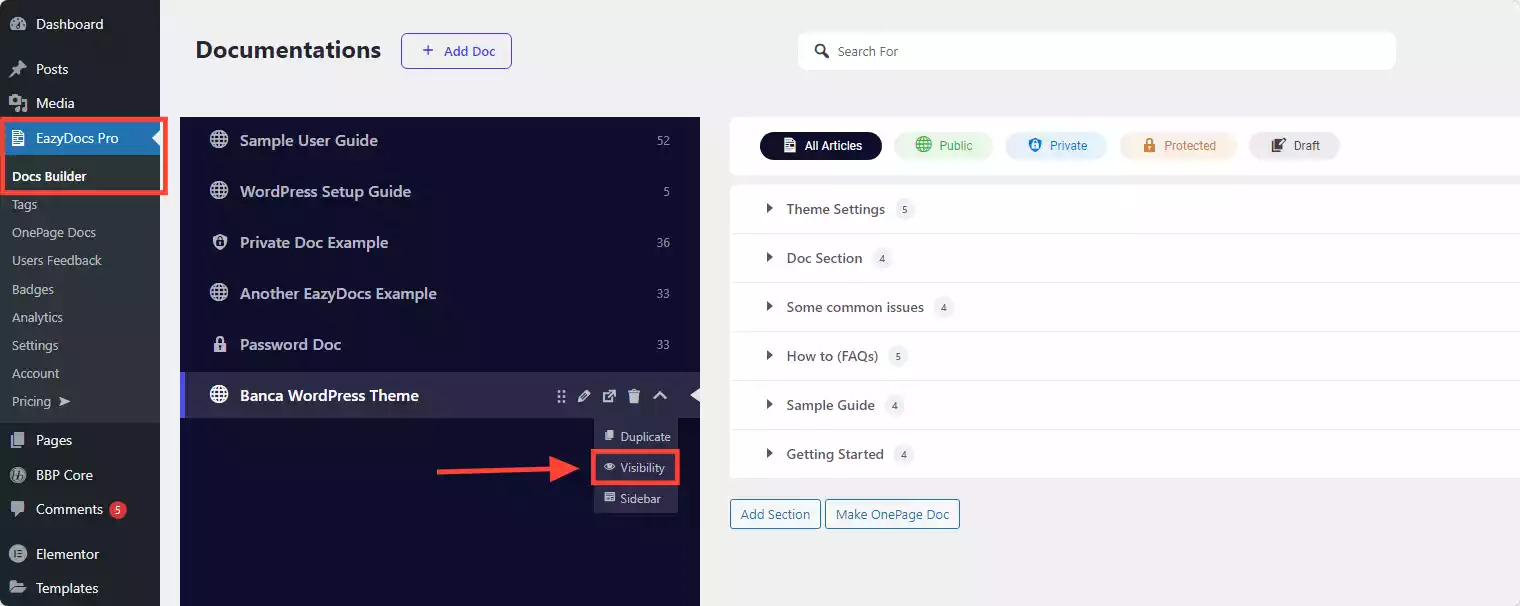 From the [direction] WordPress Dashboard > EazyDocs Dashboard, [/direction] select the documentation you want to switch to an internal doc setting. Right next to the doc title, click on the arrow icon and click on the Visibility option.